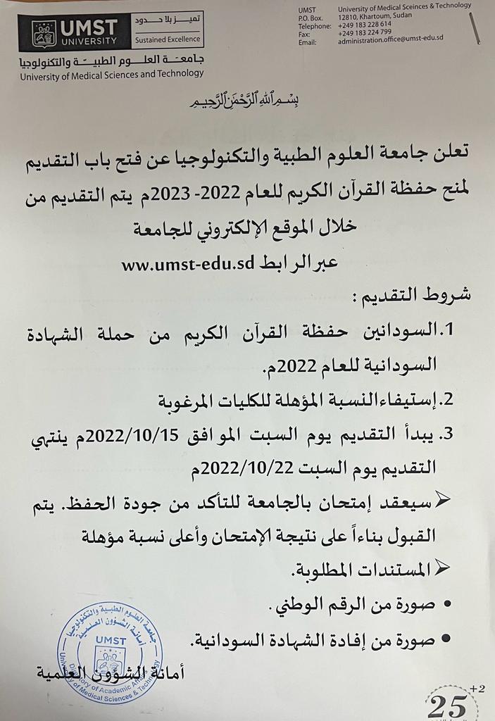تعلن جامعة العلوم الطبيه والتكنولوجيا عن فتح باب التقديم لمنح حفظة القران الكريم للعام ٢٠٢٢-٢٠٢٣